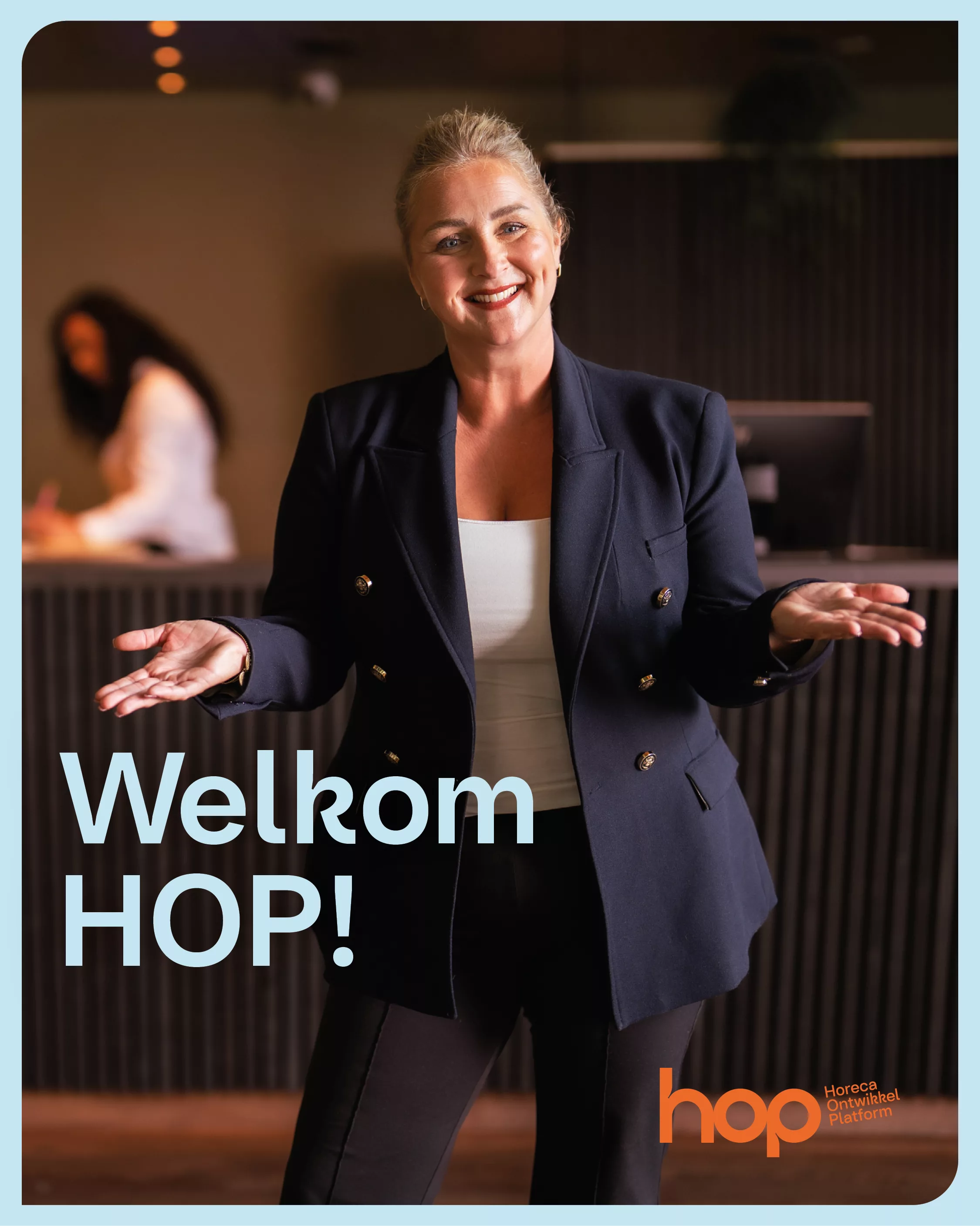 De introductiecampagne Welkom HOP! gebruikt het meest herkenbare gebaar van de horeca: iemand met open armen ontvangen. We zien geen standaard bediening, maar juist de hele wereld achter de bar en de balie; van kok tot afwasser, van housekeeping tot backoffice. Samen maken ze het gebaar van ‘kom maar binnen!’ en heten HOP welkom in hun wereld. Een positief, herkenbaar en menselijk beeld dat laat zien waar de horeca groot in is: iedereen welkom laten voelen.