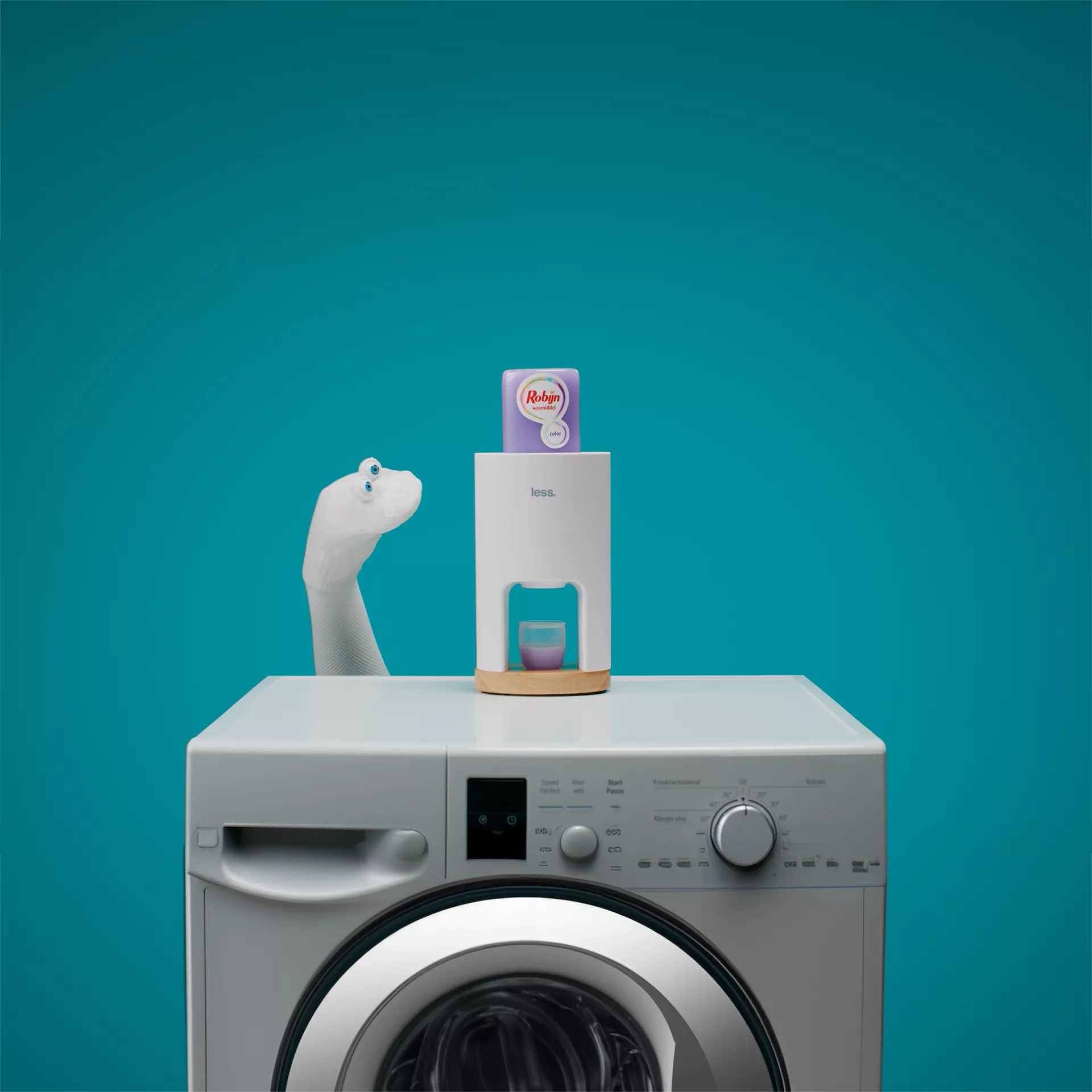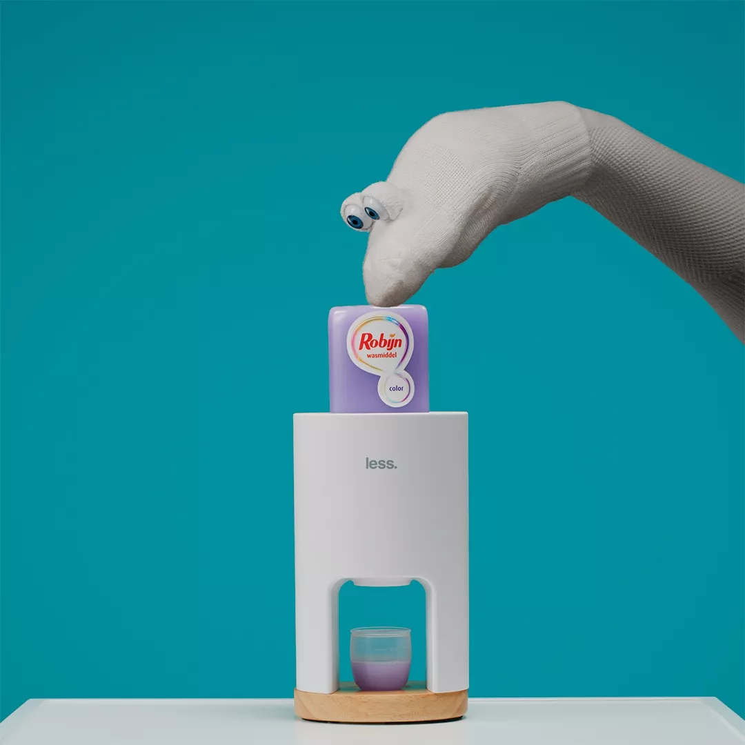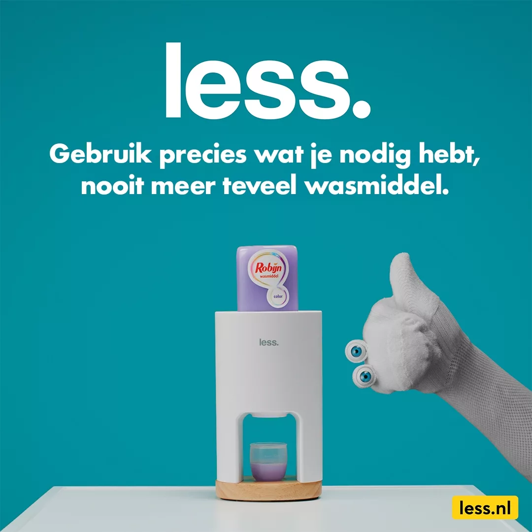 For the Unilever startup Less we developed a brand positioning and an advertising property. Less is a smart and stylish dosing system, which allows you to use just the right amount of detergent. Which is good for your clothing and the environment. The detergent bottles are delivered by mail. We developed a likeable experience expert who knows about washing. A white sock named Leslie.
